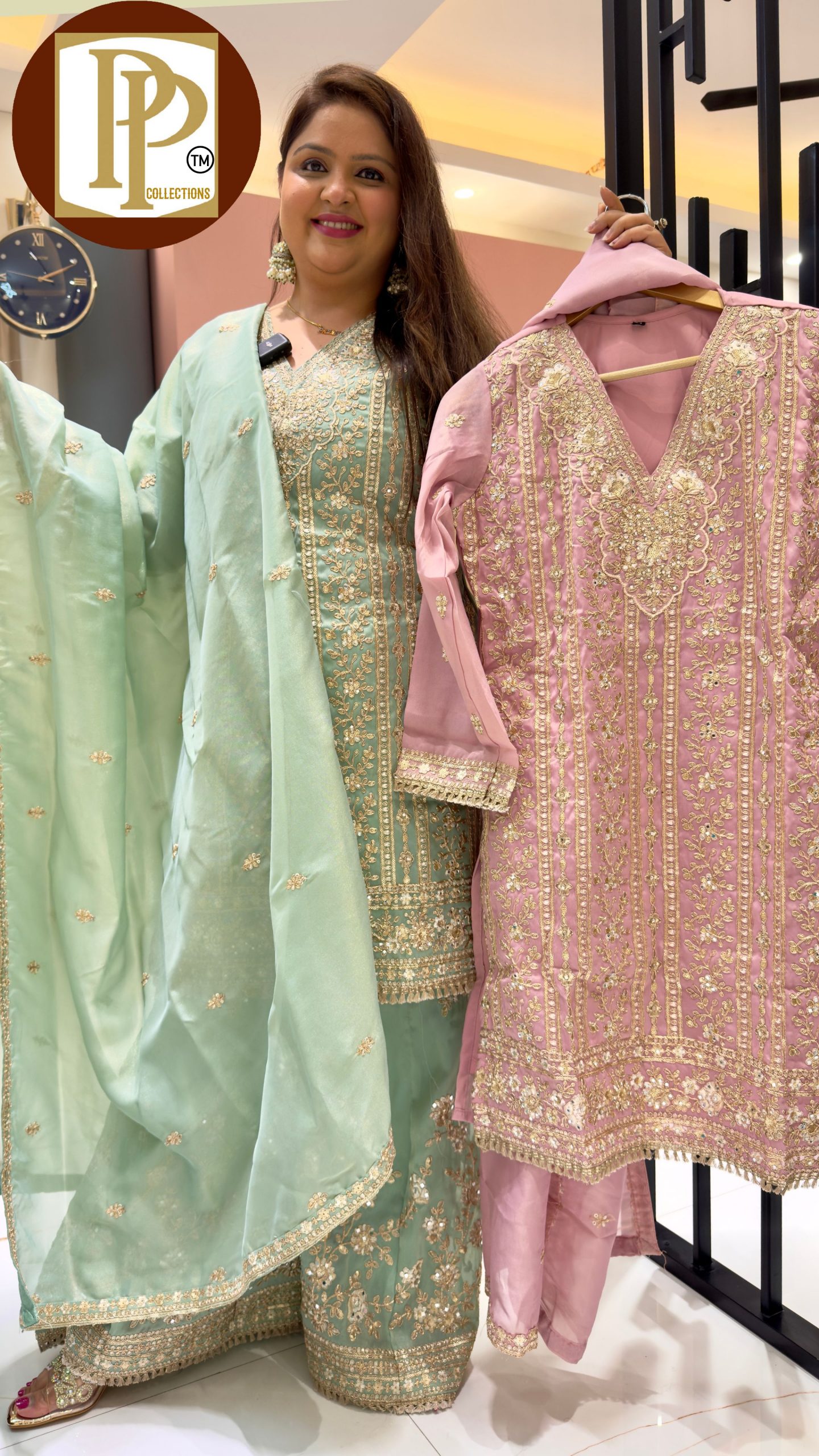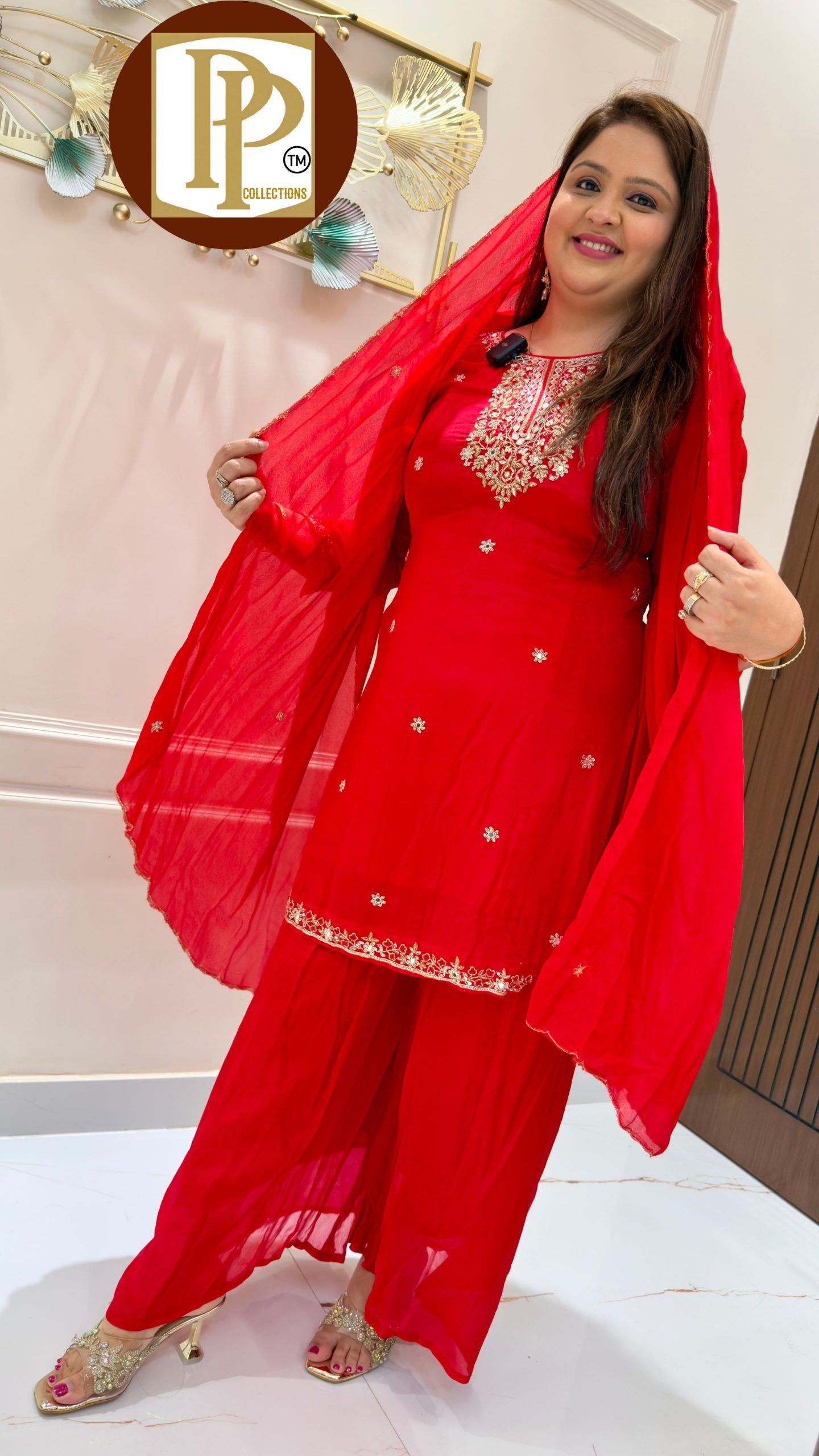 Description : 3piece Gharara Set Fabric Type : Chinnon Style : Kurti & Gharara Set Work Type : Printed On Sippy & Hand Work With Matching Dupatta.