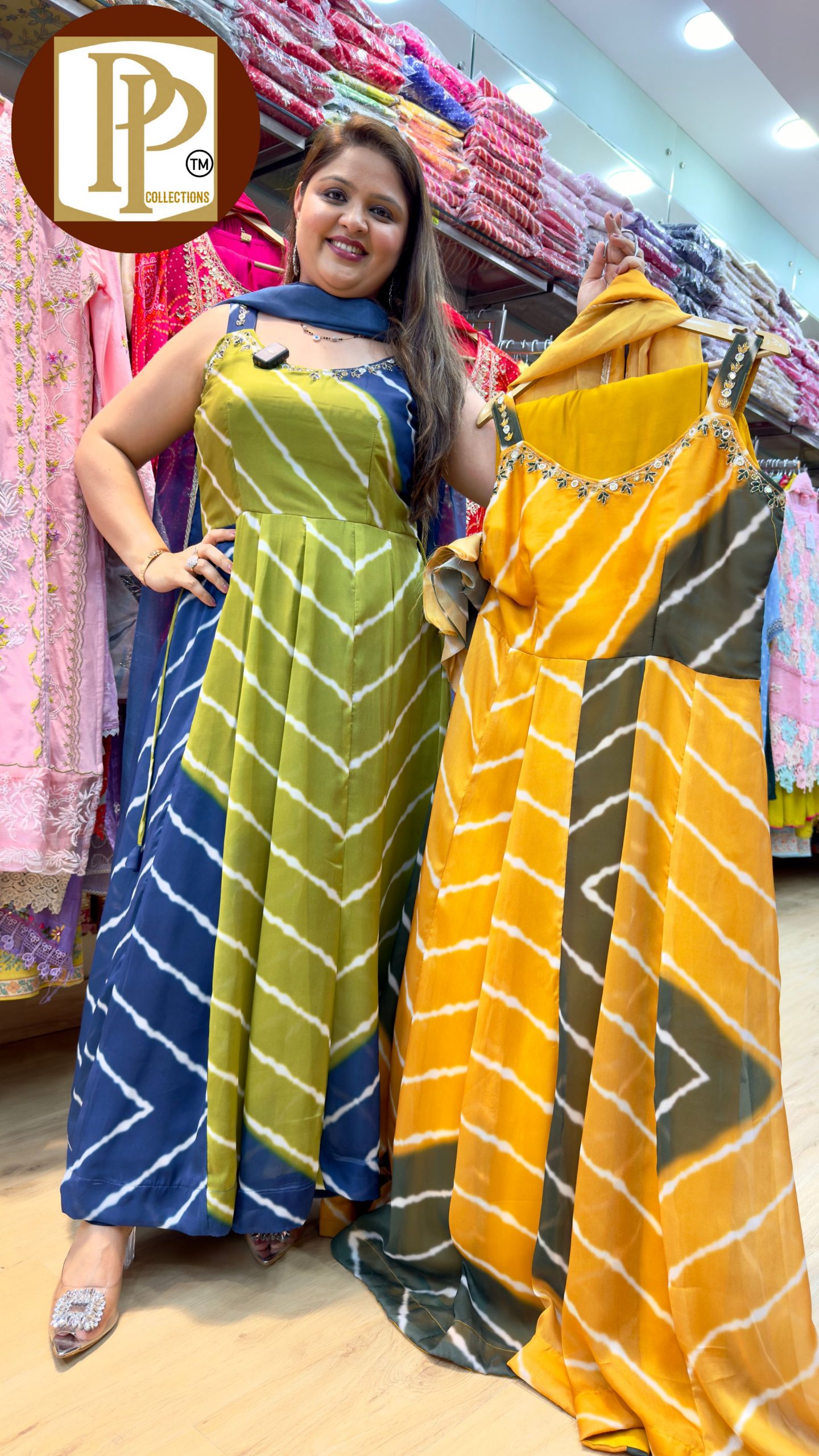 Description : 3piece Pant Set Fabric Type : Chinnon Style : Anarkali Set Work Type : All Over Print On Hand Work With Matching Dupatta.