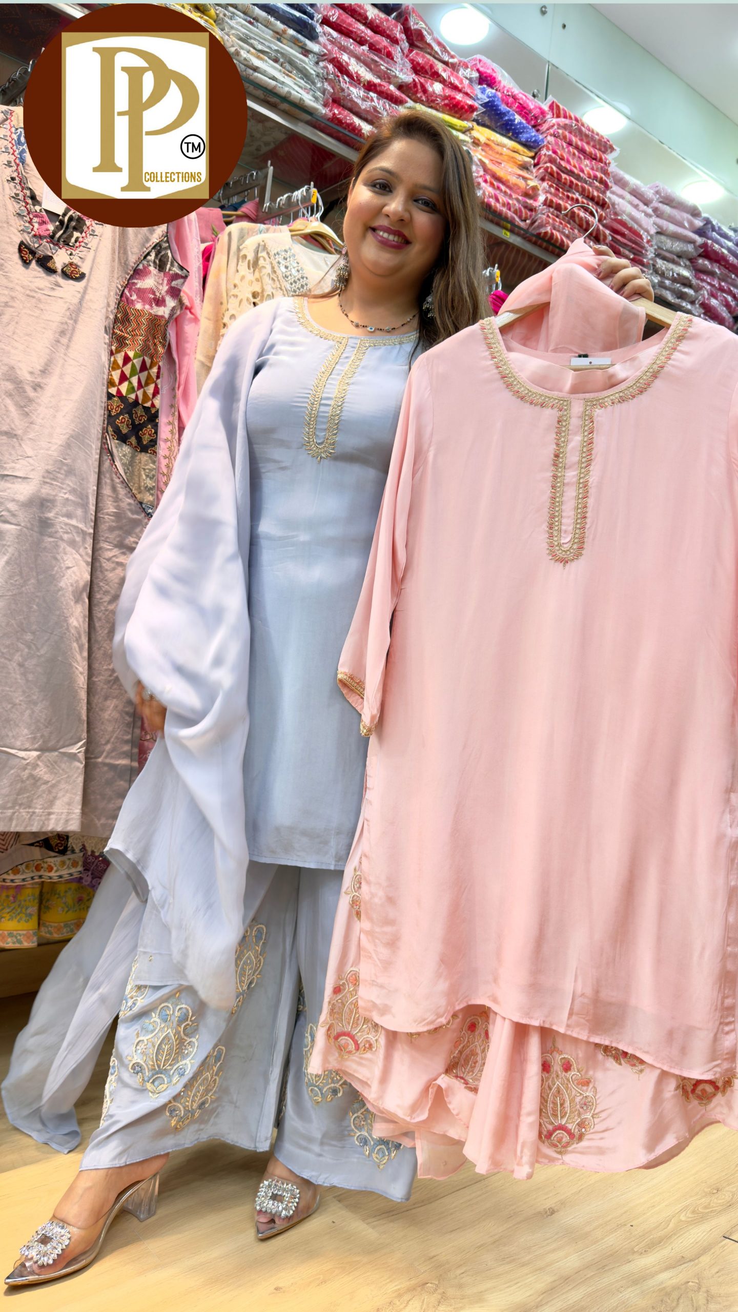 Description : 3piece Pant Set Fabric Type : Crepe Style : Straight Set Work Type : Full Cut Dana Hand Work With Matching Dupatta.