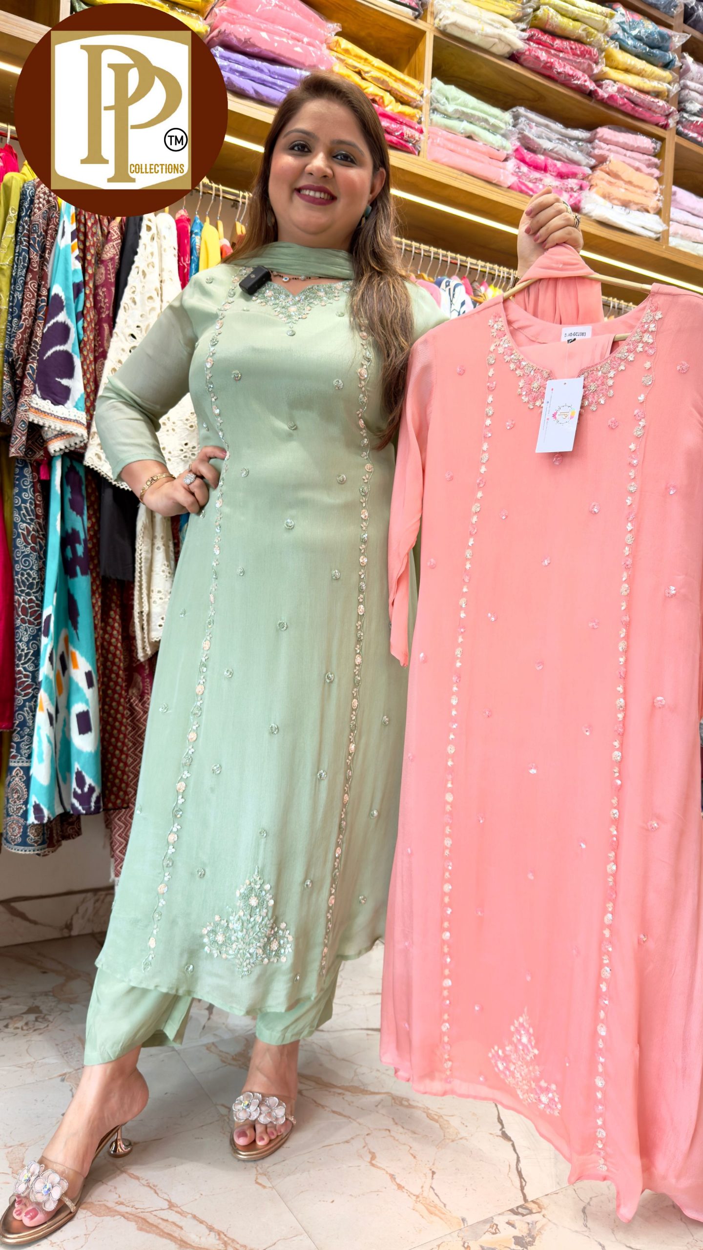 Description : 3piece Pant Set Fabric Type : Organza Style : Straight Set Work Type : Full Have Hand Work With Matching Organza Dupatta.