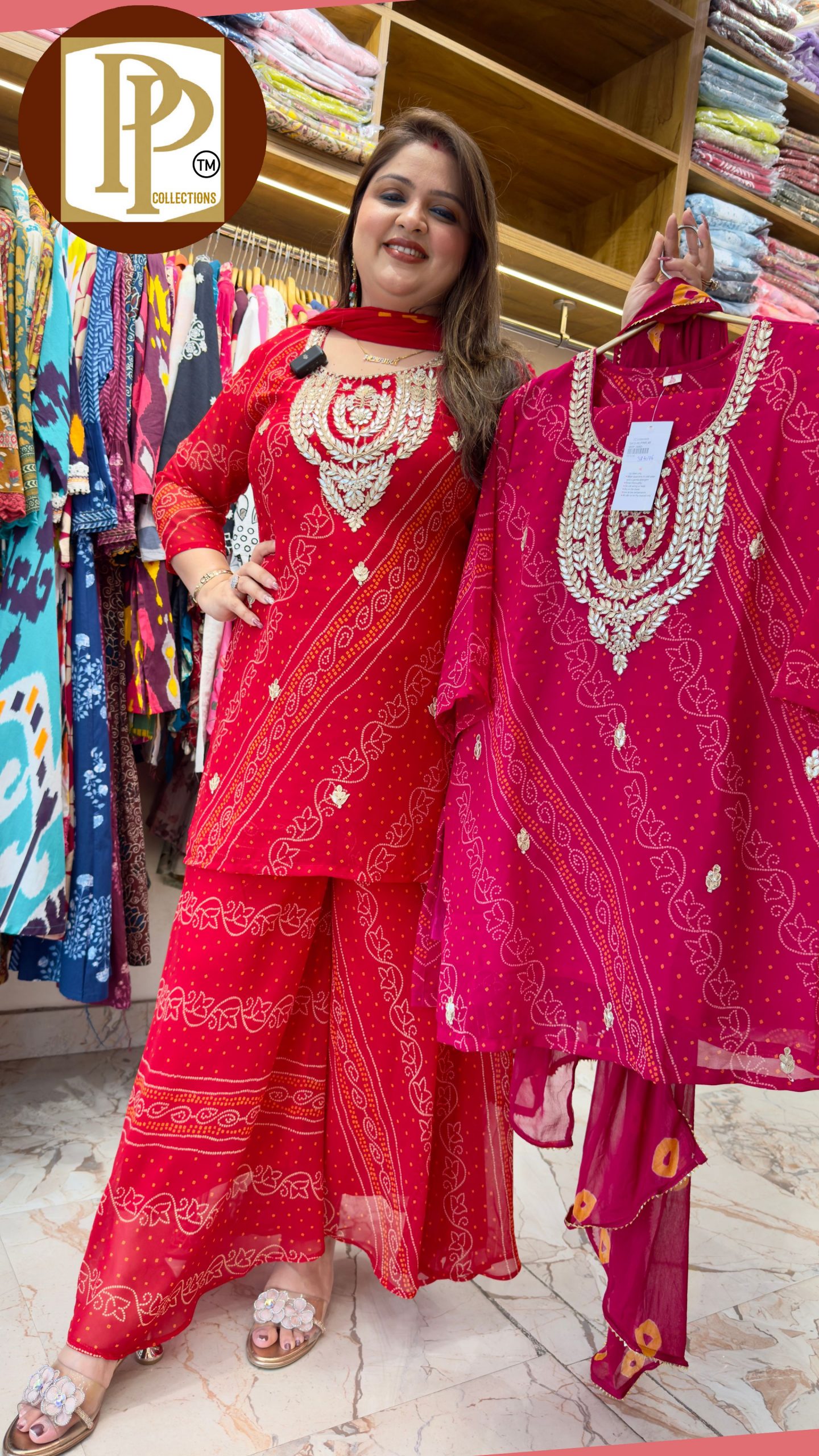 Description : 3piece Plazzo Set Fabric Type : Cotton Style : A-Line Pattern Work Type : Printed On Original Mirror Work With Matching Dupatta.