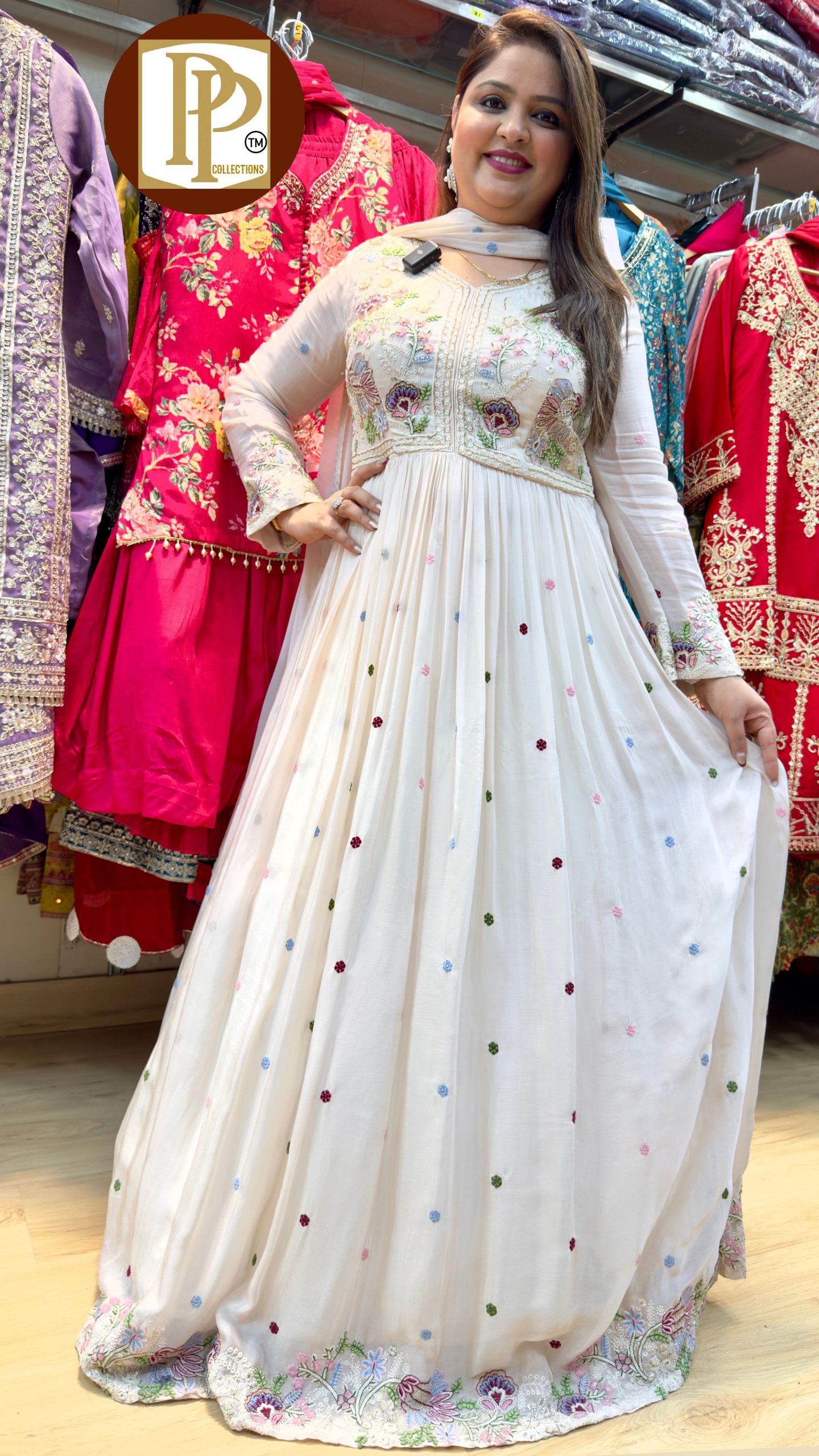 Description : 3 Pcs Anarkali set Fabric Type : wool Style : anarkli with shawl Work Type : threadwork in Anarkali with matching plain pants and contrasti shawl .