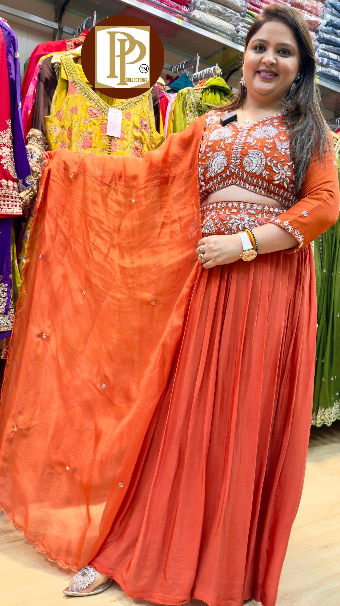 Description : 3 pcs crop top set Fabric Type : Chinnon Style : croptop with skirt style Work Type : heavy handwork in croptop and also in skirt with matching duapatta.