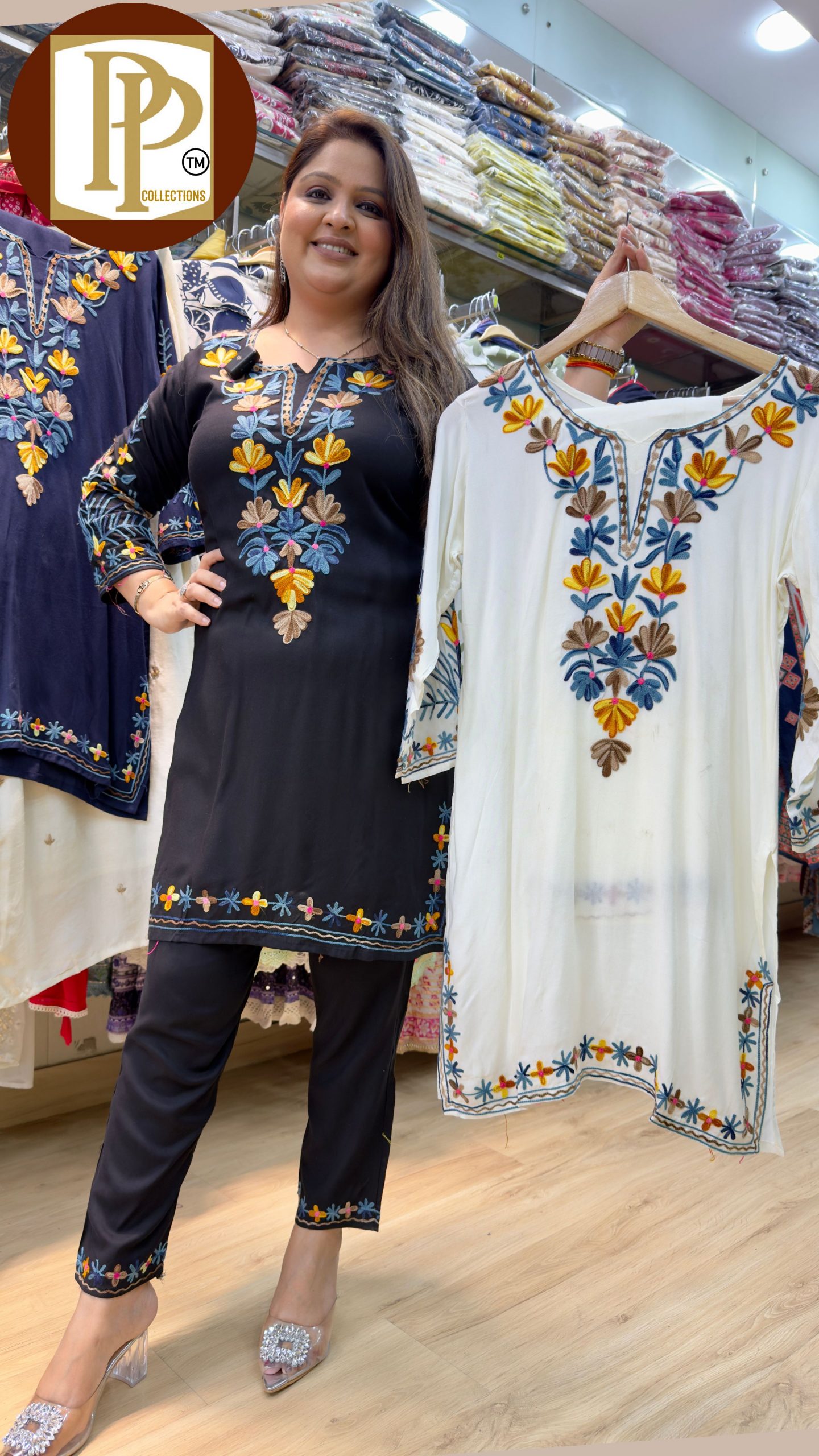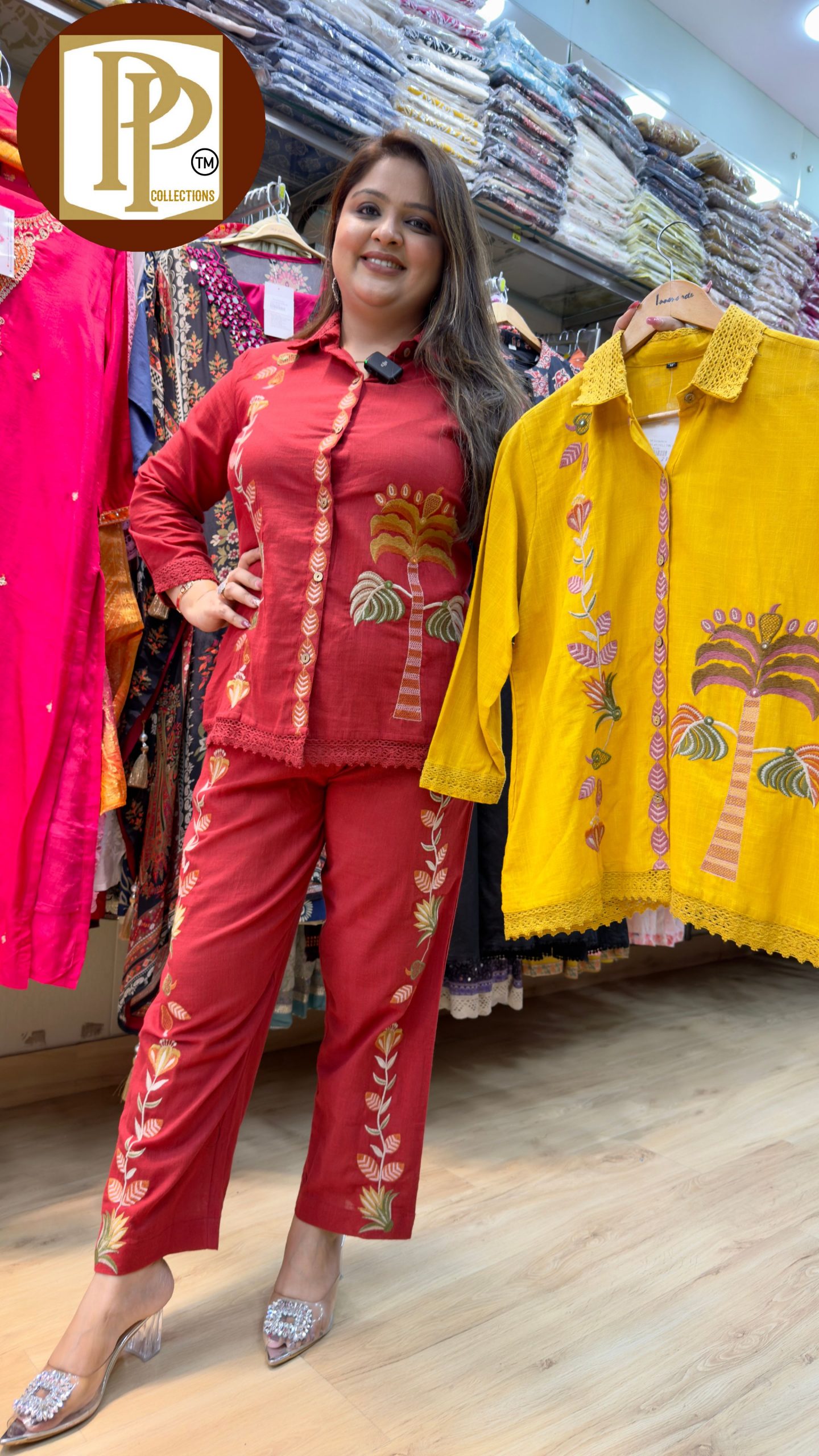 Description : 3piece Pant Set Fabric Type : Cotton Lillen Style : Co-ord Sets Work Type : Collar Pattern On Embroidery & Foil Mirror Work With Pocket.