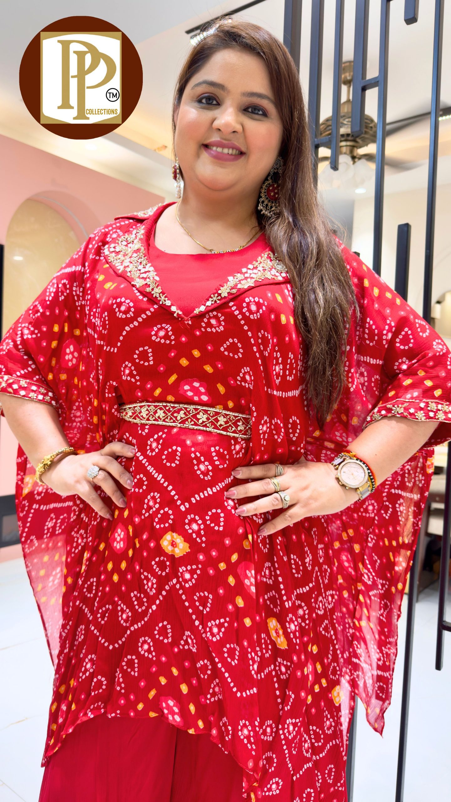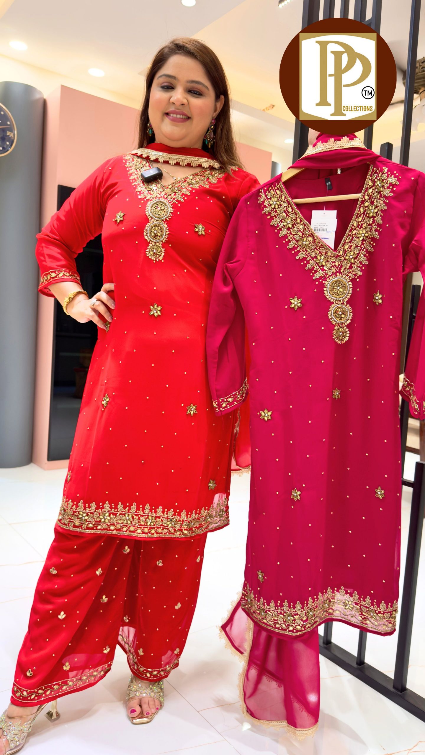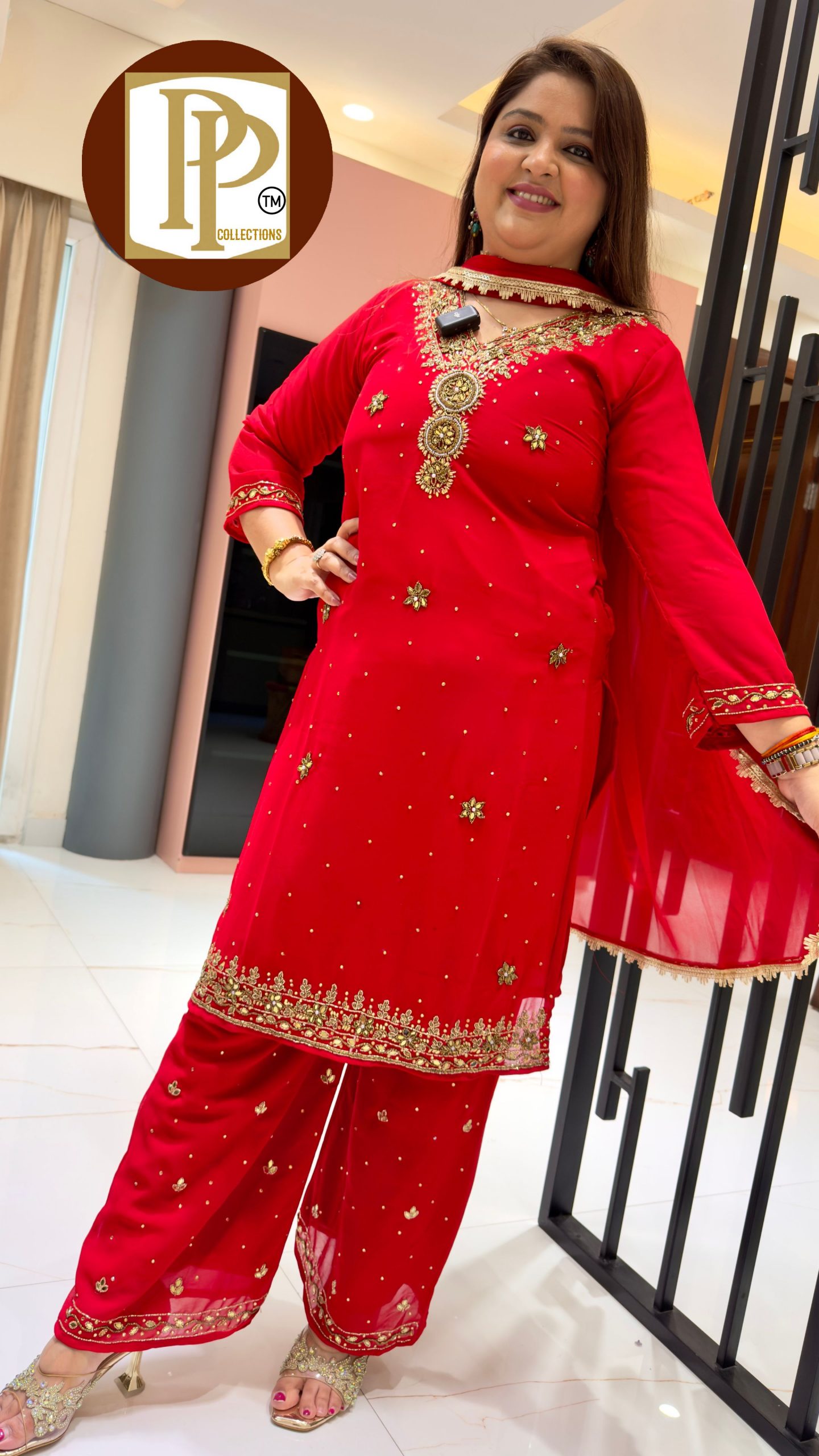 Description : 3 pcs palazzo set Fabric Type : Georgette Style : kurti with palazzo Work Type : Havey handwork in sleeves neck and dupatta