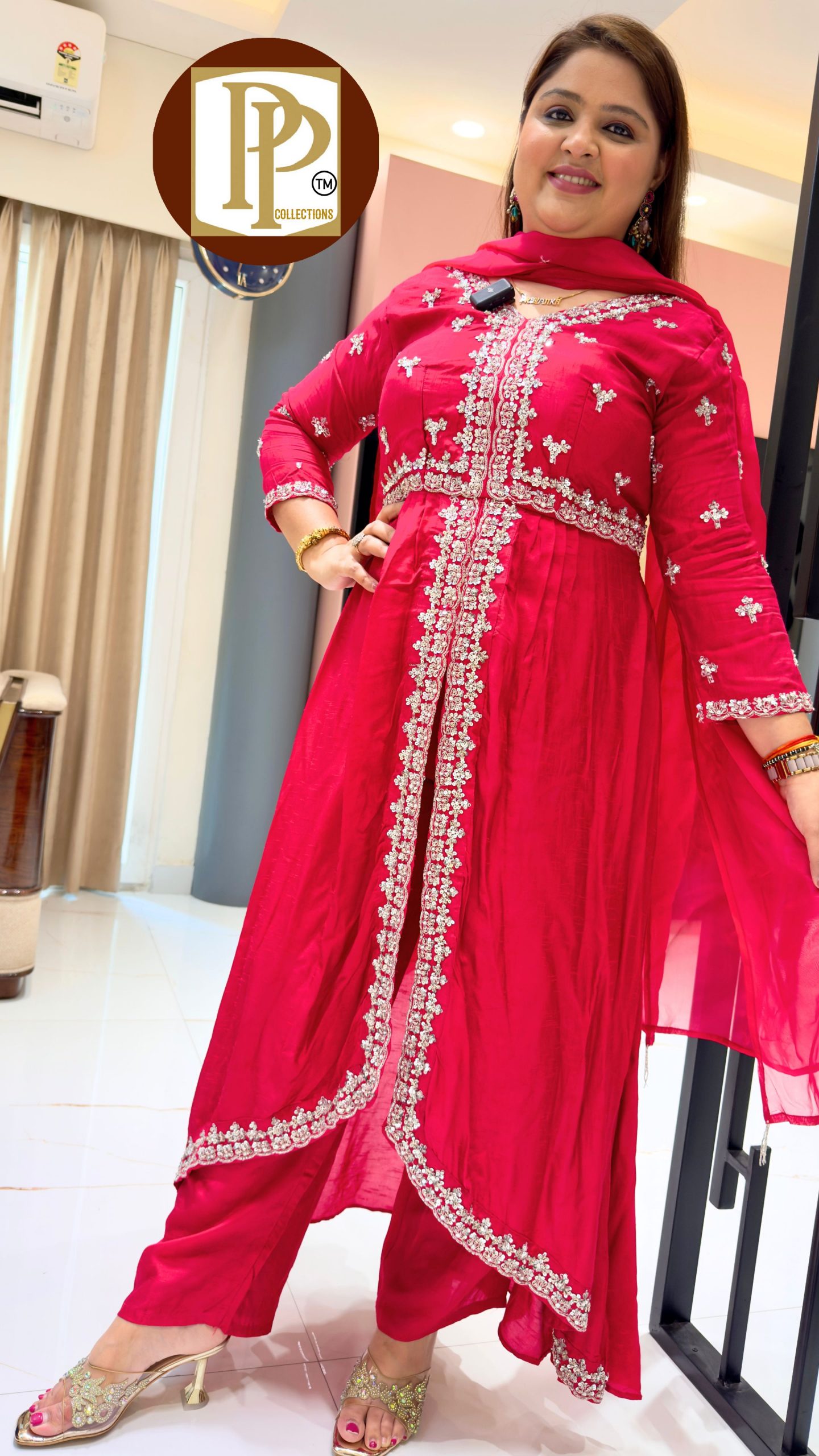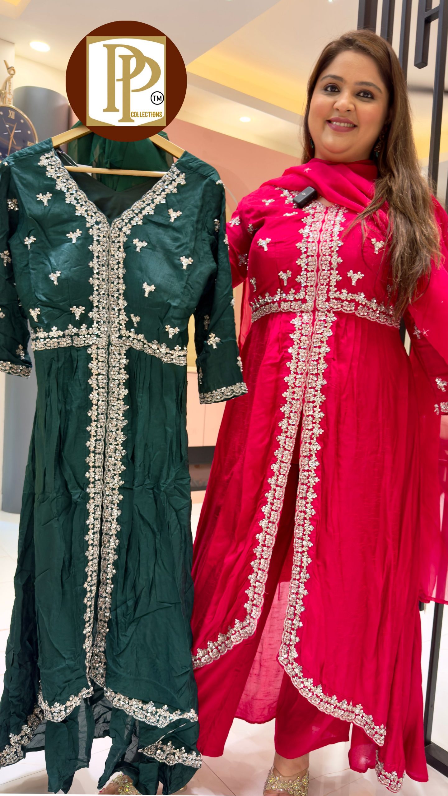 Description : front cut with pent set Fabric Type : Dola Silk Style : front kurti and plain pent . Work Type :heavy handwork with matching pent and dupatta.