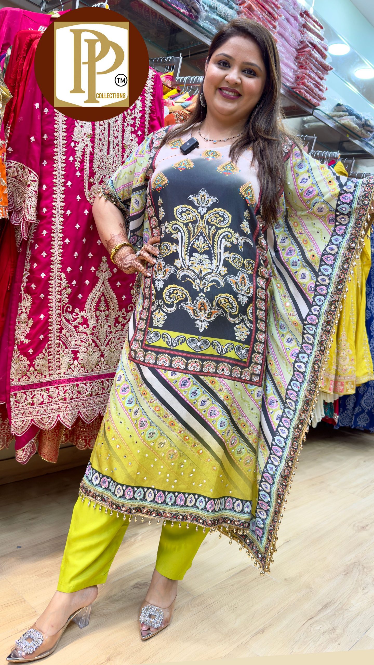 Description : 2piece kaftaan Set Fabric Type :Chinon Style : kaftaan set with potli bag Work Type : Havey Gotta pati mirror work With Matching divider and potli.
