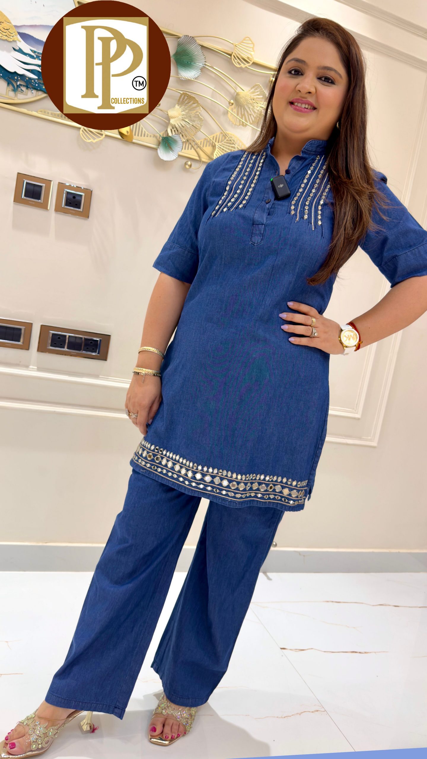 Description : 2piece Pant Set Fabric Type : Denime Style : Co-ord Sets Work Type : Thread & Original Mirror Work.