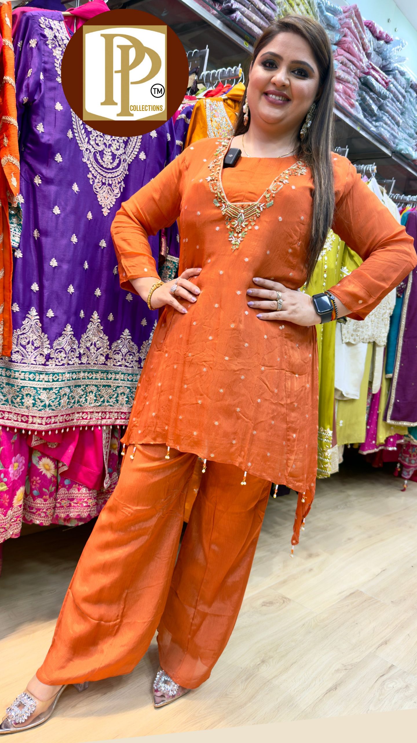 Description : 3piece plazzo Set Fabric Type : Tissue Style : cord set Work Type : Havey Hand Work cord set with pants.