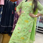 Attractive 3pc cotton pant set with thread & hand work on all over the kurta with laces work on kurta borders with thread work also on back of the kurta with laces work on pant & dupatta borders.