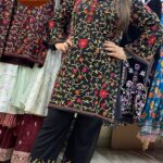 Attractive 2pc woollen kashmiri kadhai coord set with kadhai wool work on all over the top with plain woollen pants.