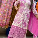 Attractive 3pc muslin pant set with hand work on V-neck with floral print pattern on all over the kurta with laces work on kurta borders with matching plain pants & matching dupatta.