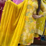 Attractive 3pc crepe pant set with hand work on V-neck with digital print pattern on all over the kurta with matching plain pants & hand work on all over the dupatta.
