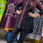 Attractive rayon 2pc coord set with thread work on all over the front, back & sleeves with matching work on pant borders.