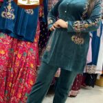 Attractive 2pc velvet cotrize velvet coordset with thread work on upper part of the top with collar styled pattern with matching hand work also on the sleeves with matching pants.