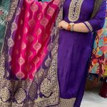 Attractive 3pc silk pant set hand & sippy work on upper part & print pattern on all over the kurta with matching hand & sippy work on borders of kurta & sleeves with matching work on pant borders with matching benarasi print dupatta.