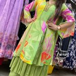 Out of StockAttractive 3pc crepe short anarkali pant set with hand work on upper part with digital print pattern on all over the kurta with matching plain pants & matching dupatta.
