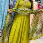 Attractive 3pc muslin anarkali pant set with hand work on upper part with matching plain palazzo pant with matching printed dupatta.