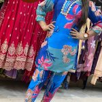 Attractive silk 2pc tulip pant coord set with hand & gota work on upper part & digital printed pattern on all over the top with matching printed tulip pant & gota work on borders of the tulip pant.