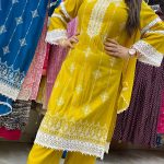 Attractive 3pcs rayon pakistani pant set with thread and laces work on all over the kurta with matching plain palazzo pant with matching dupatta.