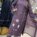 Attractive 3pc silk pant set with hand & laces work on all over the kurta with inner lining and matching pants with matching shiffon dupatta.