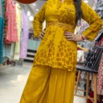 Attractive 2pc chinnon coord set with hand & thread work on pocket & buttons & print pattern on all over the shirt with matching plain palazzo.