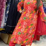 Attractive crepe 3pc pant set with hand work around V-neck & digital printed Pattern on all over the kurta with matching plain pants & matching plain shiffon dupatta.