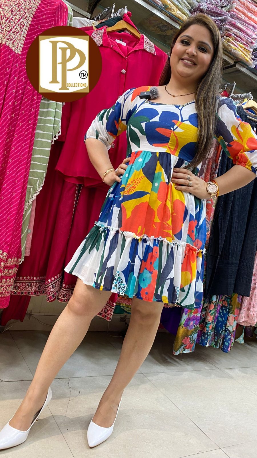 Attractive sigle piece tunic dress with multi colours print pattern on all over the dress.