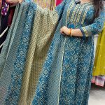 Attrctive 3pc cotton anarkali pant set with all over block print & hand work on kurta with matching printed pant & dupatta.