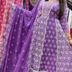 Out of StockAttractive 3pc cotton anarkali pant set with laces work on upper part with printed pattern on all over the kurta with matching pants & dupatta.