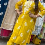 Attractive 3pc rayon pant set with chikankari hand work on all over the kurta with matching work on pants with thread work also on dupatta borders.