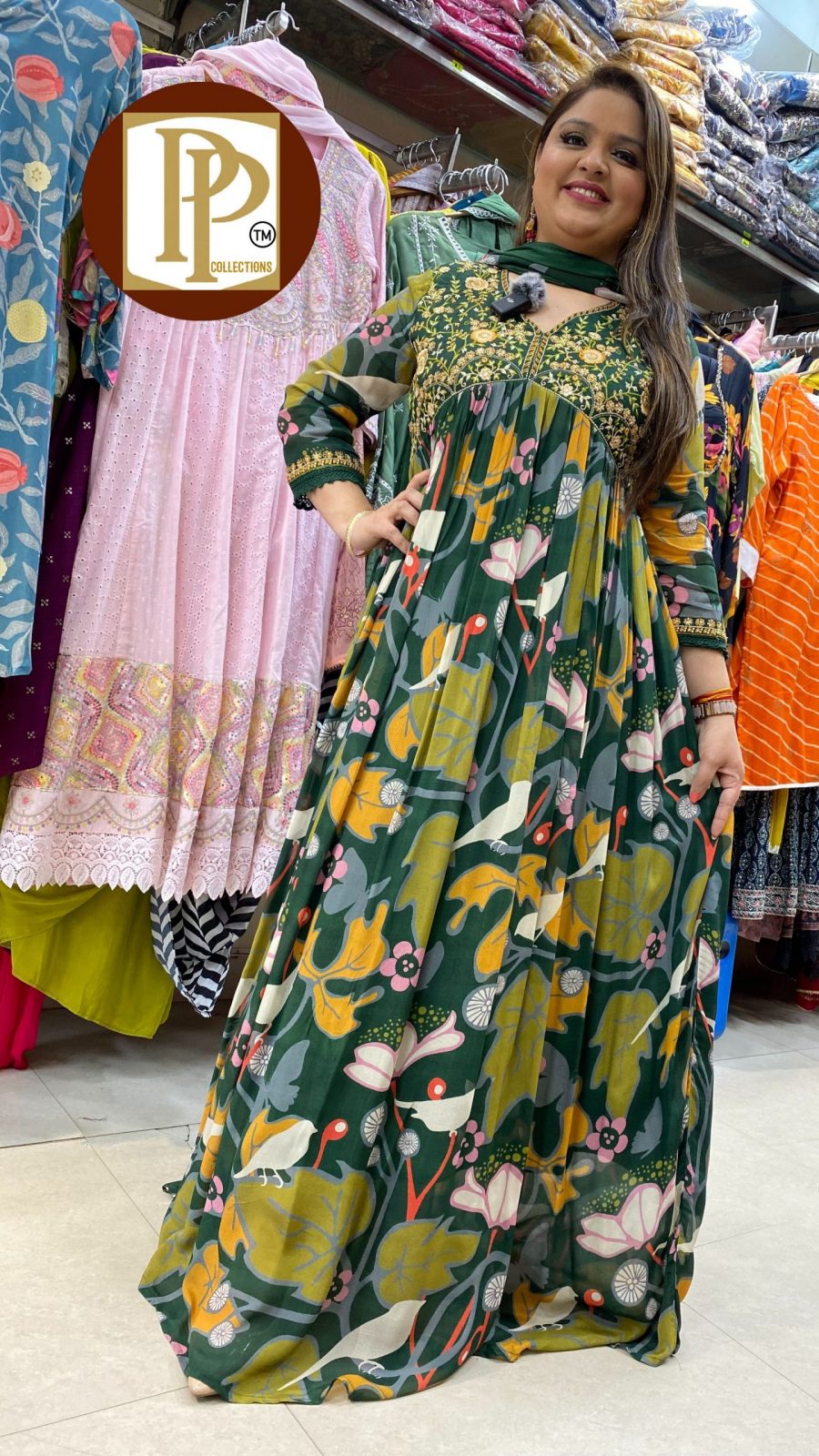 Attractive 2pc chinnon gown with hand work on upper part & print pattern on all over the gown with matching print on dupatta borders.