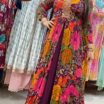 Attractive 3pc chinnon front slit cut skirt set with hand work on upper part & print pattern on all over the top with matching plain skirt with attached cancan with matching plain dupatta.