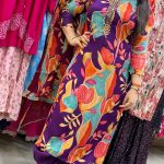Attractive 3pc chinnon pathani pant set with hand & real mirror work on upper part with digital print on all over the kurta & real mirror work on pathani pants & matching dupatta.