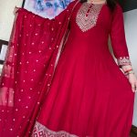 Attractive 3pc silk anarkali pant set with thread work on neck & kurta borders with matching hand work on sleeves & pant borders with all over sippy & thread work on dupatta.