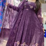 Out of StockAttractive 3pc organza anarkali pant set with hand work on upper part with digital print pattern on all over the flair with matching plain pants & matching dupatta.