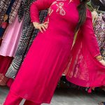 Out of StockAttractive 3pc chinnon pant set with hand work on upper part with matching plain chinnon pants with matching plain dupatta for elegant party wear.