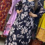 Attractive chinnon 3pc pant set with angrakha style hand work on upper part with floral print pattern on all over the kurta with matching plain pants & dupatta.