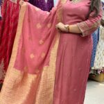 Attractive 3pc dola silk pant set with hand work on all over the kurta with matching plain pant with matching benarasi print pattern on all over the dupatta.