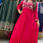 Out of StockAttractive 2pc chinnon gown with hand work on upper part & sleeves borders with attached cancan with matching shiffon dupatta.