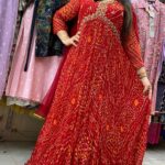 Attractive 2pc georgette bandhej gown with hand work on upper part with bandhej print pattern on all over the gown with cancan in the rich flair of the dress with matching dupatta.