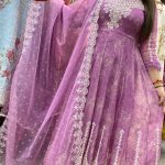 Attractive 3pc organza anarkali pant set with thread work on upper part & matching laces & thread work on borders of kurta & sleeves with matching thread work on borders of pant with matching thread work on organza dupatta borders.