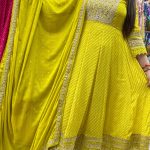 Attractive 3pc chinnon anarkali pant set with hand & original mirror work on upper part & leheriya print pattern on all over the kurta with matching hand & laces work on borders of pant, kurta & sleeves with matching laces & hand work on borders of dupatta.