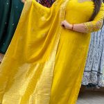 Out of StockAttractive 3pc dola silk pant set with hand work on all over the kurta with matching plain dola silk pant with matching benarsi dupatta.