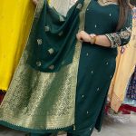Attractive 3pc dola silk pant set with hand work around V-neck with plain pants & Banarasi work on all over the matching dupatta.