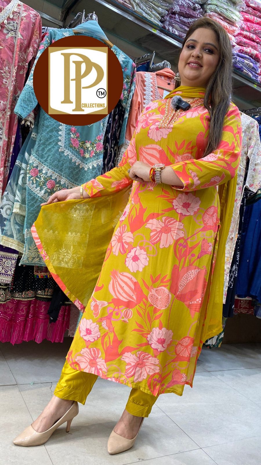 Attractive 3pc muslin pant set with hand work on upper part & print pattern on all over the kurta with matching plain silk pant with matching print pattern on borders of shiffon dupatta.