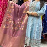 Attractive silk short anarkali dhoti pant set with hand work on all over the kurta with matching hand work also on dhoti with contrast digital print dupatta.