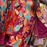 Attractive 3pc chinnon afghani pant set with hand & original mirror work on upper part & print pattern on all over the kurta with matching print on afghani pant boaders with matching print on borders of siffon dupatta.