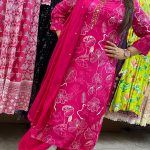 Attractive 3pc chinnon pathani pant set with hand & original mirror work on upper part with print pattern on all over the kurta with matching mirror work on pathani pant borders with matching dupatta.