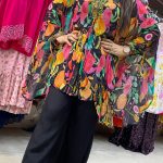 Attractive 2pc chinnon coord set with hand work on upper part with digital print pattern on all over the kaaftan with matching plain loose pants.
